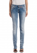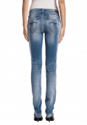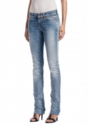 Зауженные джинсы от Ad-oro с низкой посадкой. Модель выполнена из стрейчевого денима с декоративными потертостями. Детали: застежка на молнию и пуговицу; три кармана спереди и два сзади; шлевки для ремня; стразы; молнии на штанинах внизу.