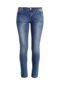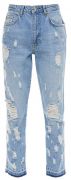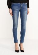 Зауженные джинсы от Ad-oro с низкой посадкой. Модель выполнена из стрейчевого денима с декоративными потертостями. Детали: застежка на молнию и пуговицу; три кармана спереди и два сзади; шлевки для ремня; стразы; молнии на штанинах внизу.