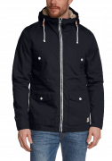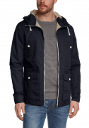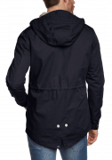 Парка выполнена из прочного непромокаемого текстиля черного цвета и утеплена синтепоном. Модель прямого кроя с кулисками на талии и по низу. Детали: регулируемый по ширине капюшон с флисовой подкладкой оторочен искусственным мехом, воротник с трикотажной подкладкой, застежка на молнию и клапан на пуговицах, один внутренний и шесть наружных карманов, внутренние эластичные манжеты, разрез на спинке сзади.